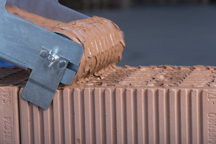 La aplicación del mortero debe realizarse de manera uniforme y controlada. Se recomienda utilizar un rodillo dosificador para asegurar la cantidad adecuada de mortero y evitar excesos o deficiencias que puedan comprometer la adherencia y la estabilidad de los bloques.